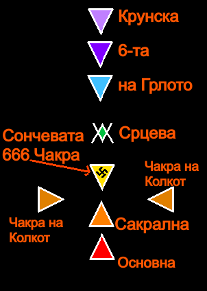 Сè што треба да направите е да ја свртите соларната 666 чакра така што точката [bindu] е свртена надолу. Ова е свастика чакра, Сончевата чакра. Сите пагански религии кои му претходеле на христијанството интензивно се фокусирале на Сонцето. Ова е моќта на душата. Чеканот на Тор првично бил во форма на превртен крст. Нашите најрани почетоци и живот потекнуваат од нашата морнарска и од Сончевата чакра, давателот на моќ и живот е центриран зад морнарицата. Ова е местото каде што нашата главна продавница на животна сила/вештерство/врил/чи се наоѓа. Сончевата чакра е поврзана со 6-та чакра и третото око, исто така познат како „команден центар“ кој е женски.